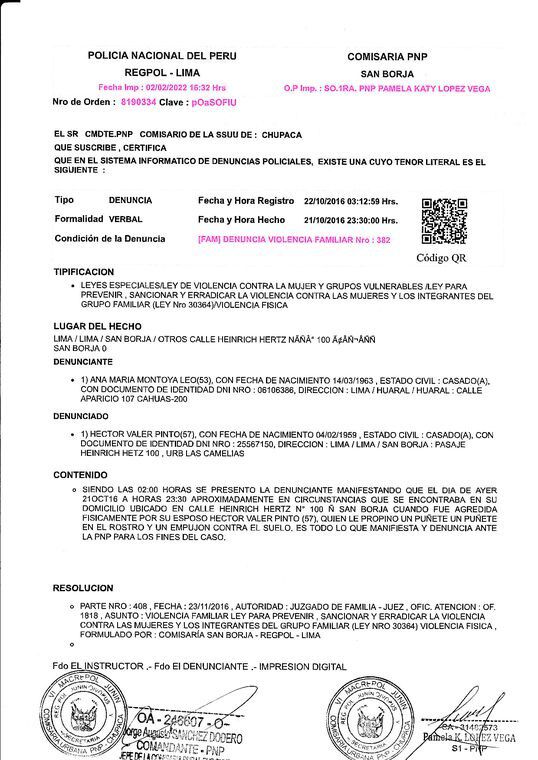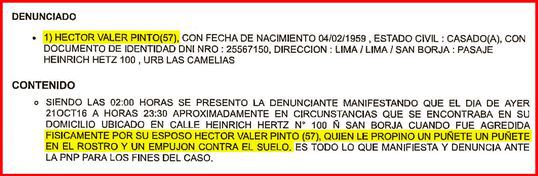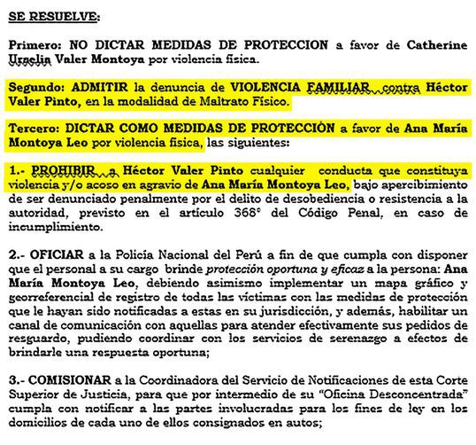 Por su parte, Ana Montoya señaló que su esposo “le propinó un puñete en el rostro y un empujón contra el suelo”. El 8 de febrero del 2017, el 9º Juzgado de Familia de Lima dictó medidas de protección a favor de Ana Montoya y prohibió a Valer realizar cualquier conducta que constituya violencia y/o acoso en agravio de su esposa.