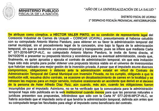 Colusión. La Fiscalía considera que Héctor Valer se coludió con alcalde para obtener un contrato de administración de un camal. Luego, no cumplió con el servicio y se produjo la muerte de una persona.