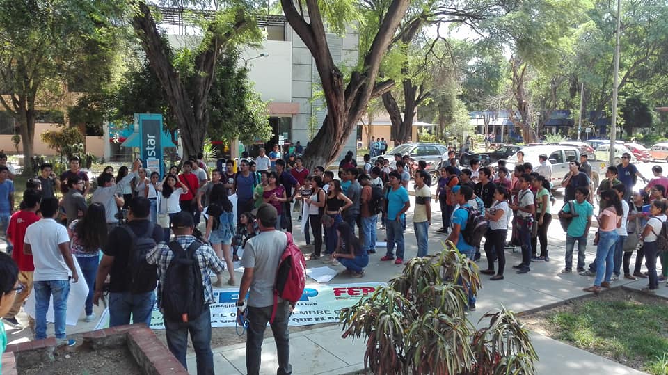 En los exteriores del rectorado de la UNP, los alumnos protestan y cuestionan que ninguno de sus dirigentes participe de dicha sesión. La presidenta de la Federación de Estudiantes, Tatiana Guerrero Hualpa, pide al rector que no les niegue el ingreso porque es un derecho que les corresponde.