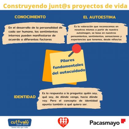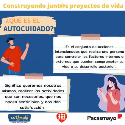 «El autocuidado es una conducta que protege la salud de las personas. Se relaciona con la autorresponsabilidad. Significa querernos nosotros mismos, realizar las actividades que son necesarias, que nos hacen sentir bien y nos dan satisfacción». Así definió la psicóloga Isabel Requena Barreto, coordinadora de Construyendo juntos proyectos de vida -que ejecuta Cutivalú en alianza estratégica de Pacasmayo durante el taller de Autocuiodado en el que participaron adolesncetes del colegio Fe y Alegría N°49