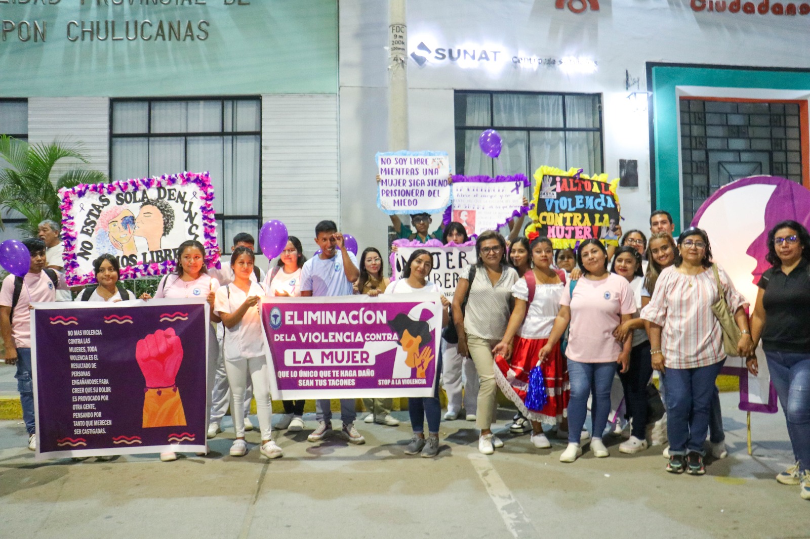 Treinta y cinco integrantes de la Red de Soporte y Acompañamiento a Víctimas de Violencia de Chulucanas conmemoraron el Día Internacional de la Eliminación de la Violencia contra la Mujer a través de pasacalles y actividades informativas.