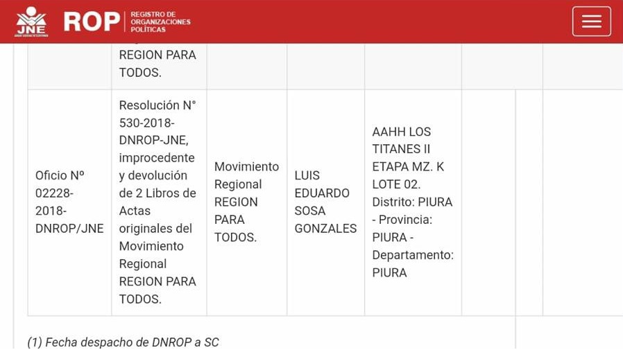 En entrevista con CUTIVALÚ, el presidente de Región Para Todos y candidato al Gobierno Regional, Santiago Paz López, negó que la agrupación haya sido notificada sobre la resolución N° 530-2018 de la DNROP (ente del JNE) que declara improcedente la inscripción de su Junta directiva (2014-2018) y les devuelve dos libros de actas.
