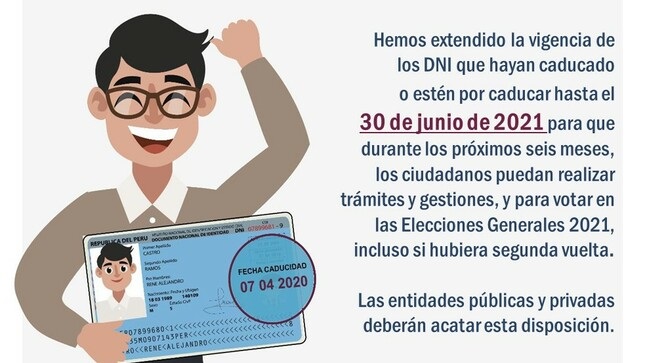 El Registro Nacional de Identificación y Estado Civil (Reniec) anunció que los Documentos Nacionales de Identidad (DNI) que hayan caducado o estén por caducar mantendrán su vigencia hasta el mes de junio de 2021. Así los ciudadanos no tendrán obstáculos al momento de votar en las Elecciones Generales 2021, y podrán llevar a cabo actos civiles, comerciales, administrativos o judiciales