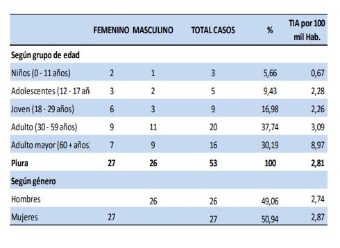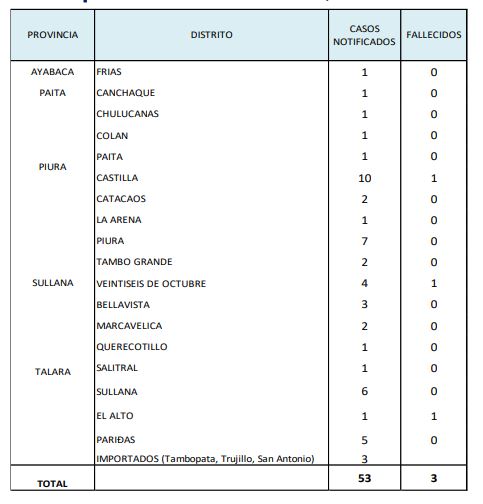 Los distritos con mayor cantidad de casos son Castilla (10), Piura (7), Sullana (6), Pariñas (5) y Veintiséis de Octubre (4).