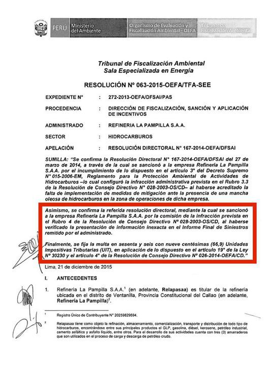 Según la OEFA, la refinería La Pampilla cuenta con un historial de 32 infracciones, cuya multa total bordea los 500.000 soles (115 UIT). En todas apeló. La más grave sucedió en el 2013, cuando hubo un derrame en la playa Cavero de Ventanilla. Ese año brindó información inexacta. Informó que se habían filtrado 7 barriles cuando en realidad fueron 190. La multa, de 250.000 soles incluyó el hecho de no controlar eficientemente el impacto.