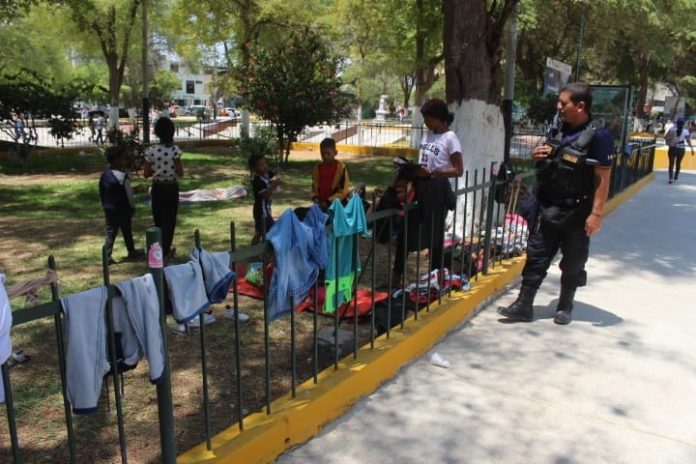 Los serenos llegaron hasta el parque infantil “Miguel Cortés” y retiraron a los ciudadanos extranjeros que no contentos con instalar sus carpas para dormir y descansas, también lavaban su ropa en este mismo espacio y usaban la cerca de fierro para tender su ropa.