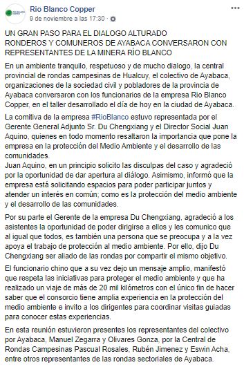 Sin embargo, horas después la empresa Río Blanco compartió una nota de prensa en su cuenta de Facebook donde asegura haber tenido “mucho diálogo” con la central de rondas y el colectivo Ayabaca.