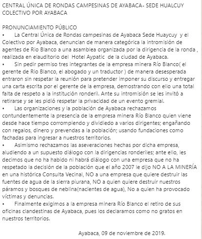 “Sin pedir permiso tres integrantes de la empresa minera Río Blanco (el gerente de Rio Blanco, el abogado y un traductor) de manera desesperada entraron sin respetar la reunión para pretender imponer su discurso y entregar una carta escrita por el gerente de la empresa, demostrando con ello una total falta de respeto a la institución ronderil”, reza el comunicado.