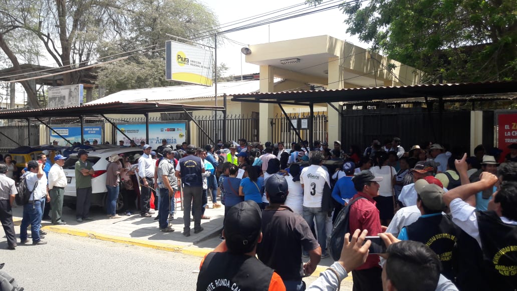 Decenas de ronderos, comuneros, trabajadores de salud y otros representantes de la sociedad civil de Huancabamba protestaron este lunes fuera de la Dirección Regional de Salud (Diresa) exigiendo la transferencia de presupuesto para pagar los bienes y servicios que permiten una atención mas o menos digna de los pacientes.