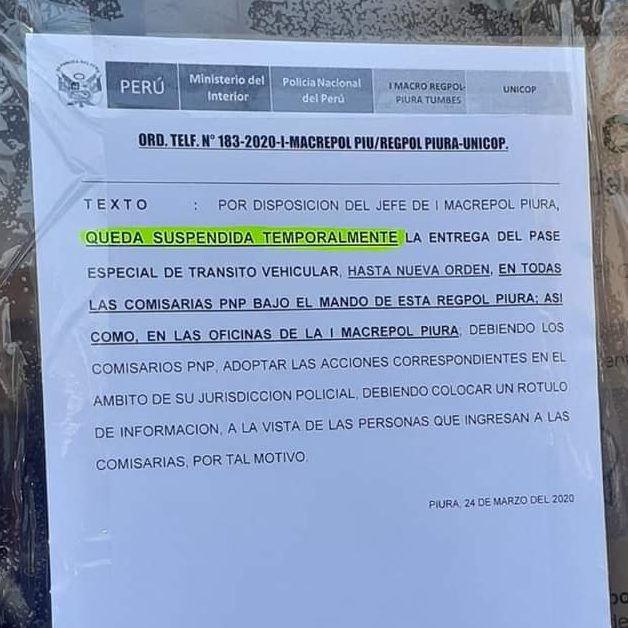 El jefe de la Región Policial Piura, Crnel PNP Edward Espinoza López, informó que ya no será necesario tramitar el permiso especial de tránsito, tal como lo venían haciendo algunos trabajadores en los exteriores de la sede policial y que provocó la aglomeración de gente pese a la Emergencia Nacional que decreta aislamiento social para evitar la propagación del Covid-19