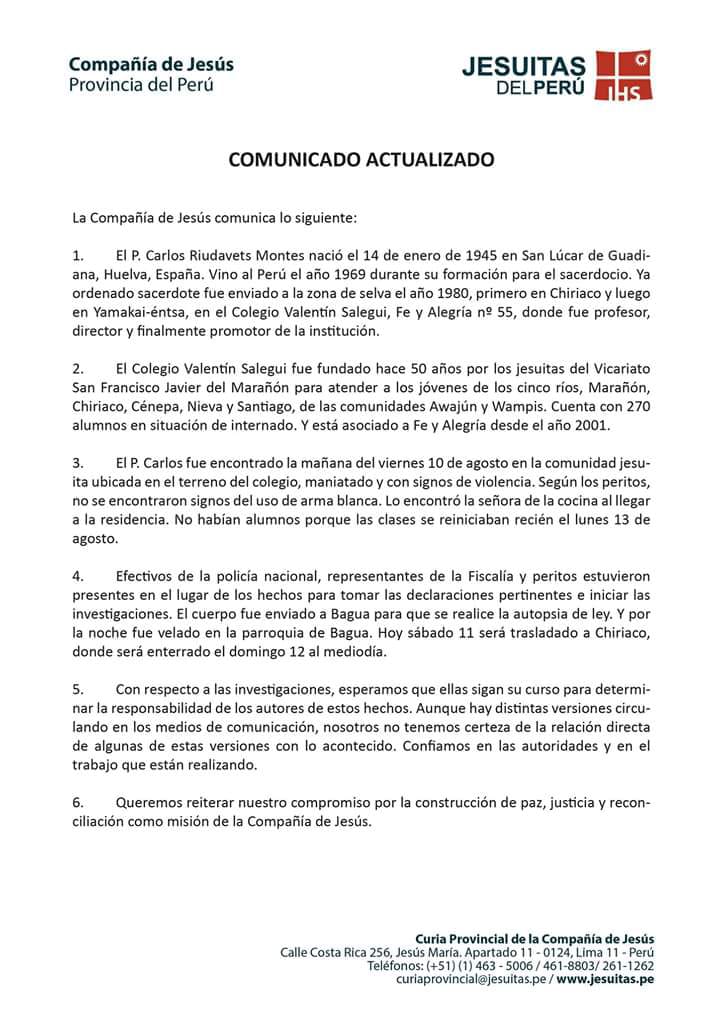 El sacerdote jesuita Carlos Riudavets Montes fue asesinado este viernes dentro de la colegio Fe y Alegría de la comunidad nativa Yamakentsa, en el distrito de Imaza, provincia de Bagua (Amazonas).