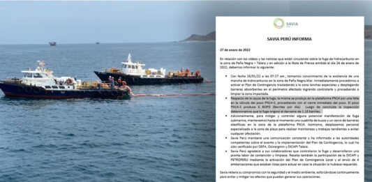 La empresa Savia emitió su segundo comunicado en el que reitera que tomaron conocimiento del derrame petróleo en Peña Negra, Talara, el miércoles 26 de enero de 2022 a las 07:27 am., por lo que recién en ese momento activaron el Plan de Contingencia “trasladando a la zona lanchas especiales y desplegando barreras absorbentes en … Sigue leyendo Savia confirma derrame de 1.18 barriles de petróleo sobre el mar de Talara