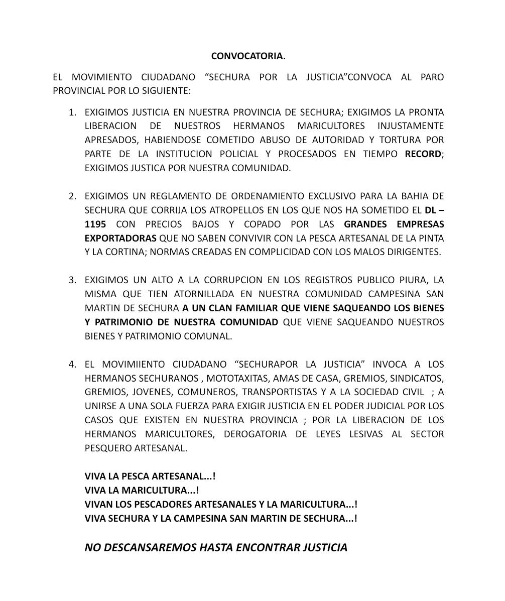El Frente de Defensa de Sechura anunció que realizará un paro provincial el lunes 18 de enero para pedir la liberación de los maricultores William Ormeño Medina, Víctor Ormeño Medina, Edú Ormeño Lizama y Julio Lima Vera, quienes fueron apresados de manera preventiva durante siete meses, después de ser denunciados por robo agravado en contra de dos trabajadores de la empresa Compañeros del mar, en medio de una disputa por la extracción de un área de concha de abanico.