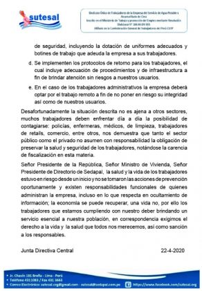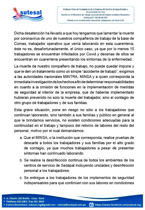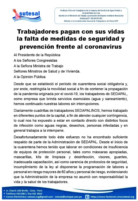 El sindicato de trabajadores de Sedapal (Sutesal) denunció que desde el inicio de la cuarentena han laborado sin mascarillas, kits de limpieza y desinfección, visores y guantes. Además, señalan que la administración de Sedapal no ha realizado las capacitaciones para prevenir el contagio del virus durante el estado de emergencia y que trabajadores mayores de 60 años continúan con sus labores a pesar de ser población de riesgo.