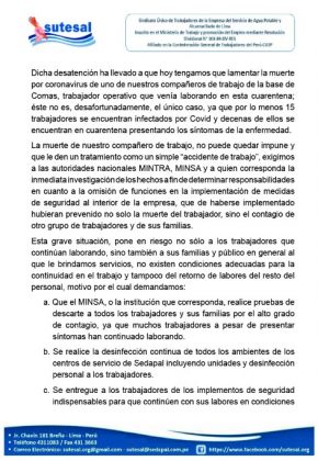 Según un pronunciamiento emitido por la Junta Directiva Central de Sutesal, la falta de protocolos de seguridad tuvo como consecuencia la muerte de uno de los trabajadores, mientras que 15 trabajadores se encuentren infectados con el virus y decenas de operarios están en cuarentena por presentar síntomas.