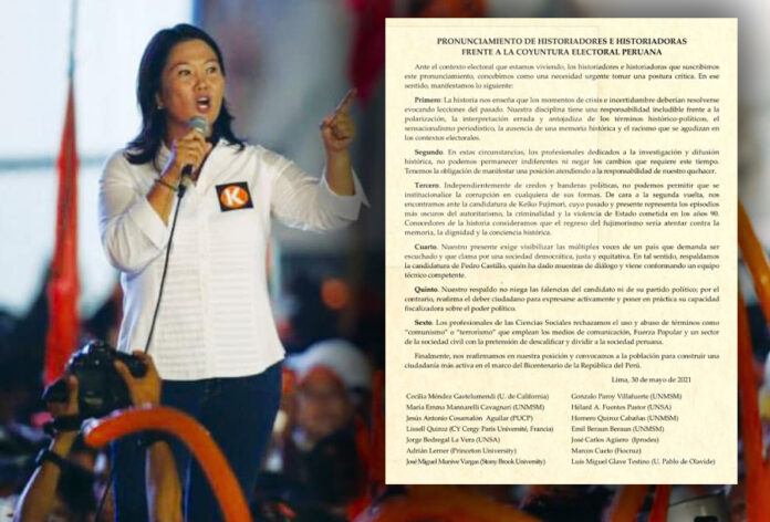 Este panorama abre la posibilidad de que Keiko Fujimori, hija del expresidente Alberto Fujimori, quien cumple una condena de 25 años por delitos de lesa humanidad, pueda ocupar el sillón presidencial. Frente a ello, más de 180 historiadores e investigadores peruanos emitieron un pronunciamiento para mostrar su rechazo a la candidata del partido naranja.