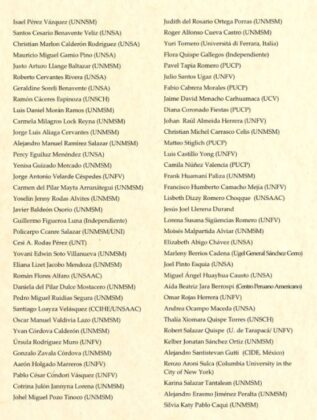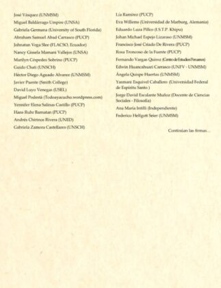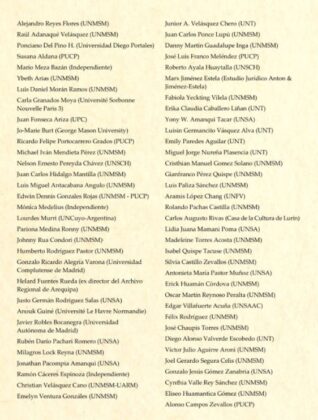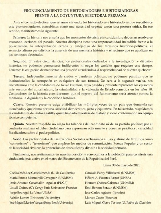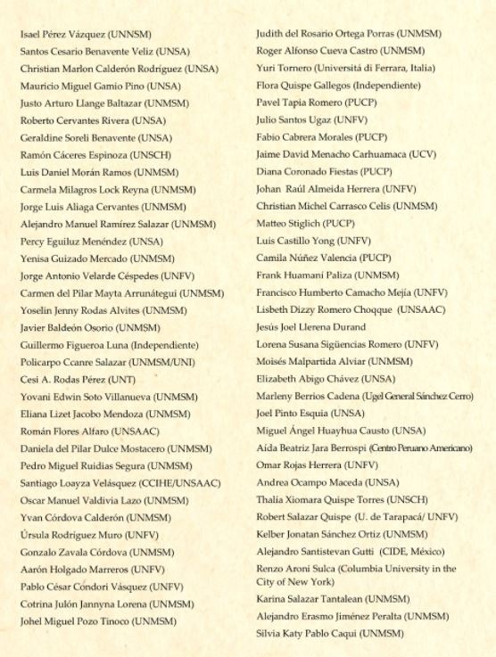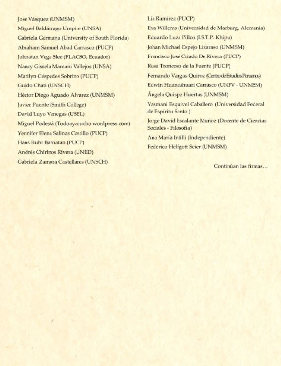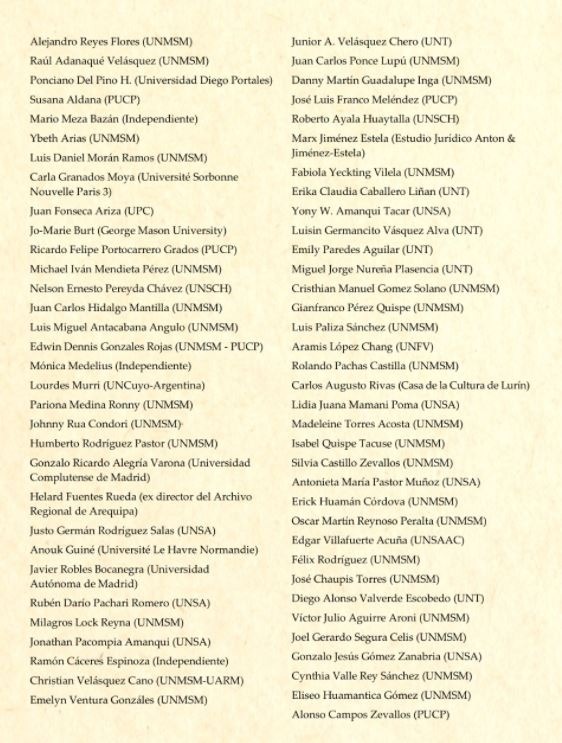 El pronunciamiento está firmado por 180 historiadores e investigadores de Historia y CCSS. de las universidades peruanas UNMSM, PUCP, UNFV, UNT, UNSA, UNSCH, así como de peruanos en universidades de EEUU, Francia, España, México, entre otros.