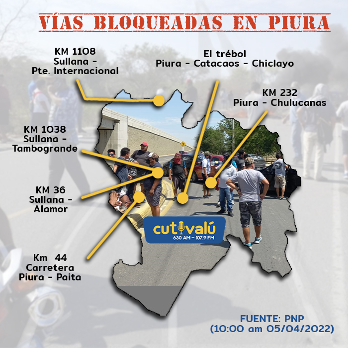 Sin embargo, las vías interprovinciales sí permanecen bloqueadas. Es el caso del trébol Piura- Chiclayo- Catacaos y el puente Grau, a la altura de La Legua.