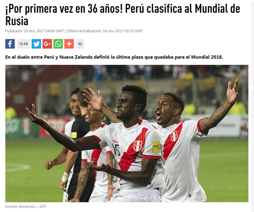 La selección peruana venció este miércoles a Nueva Zelanda con dos goles de Jefferson Farfán y Christian Ramos. El país entero explotó en júbilo luego de que esta victoria le permitiera clasificar al Mundial Rusia 2018.