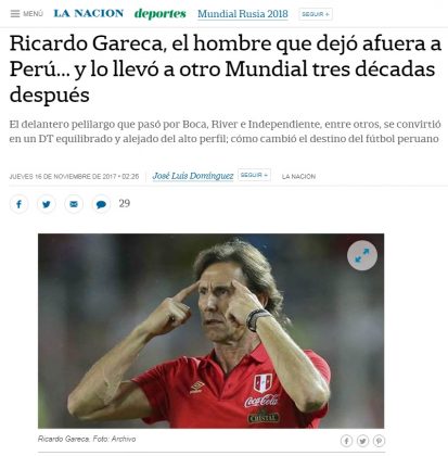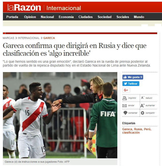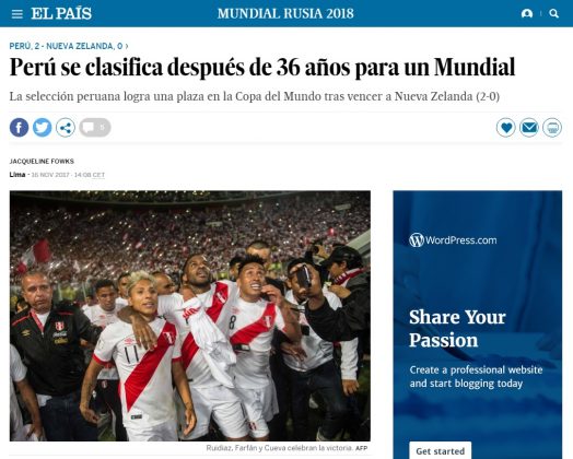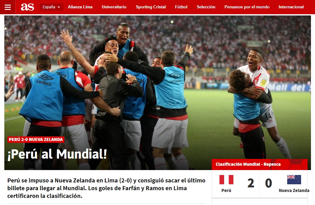 Los medios extranjeros destacaron la hazaña peruana de disputar, luego de 36 largos años, el máximo torneo internacional de fútbol. El diario El País de España señaló que «los años de corrupción de Manuel Burga como presidente de la federación peruana de fútbol fueron un obstáculo para el trabajo deportivo».