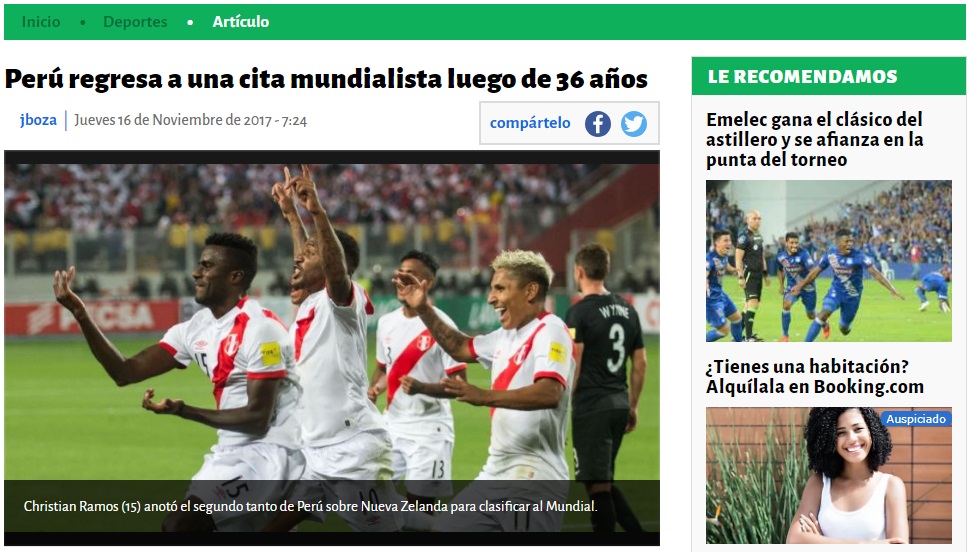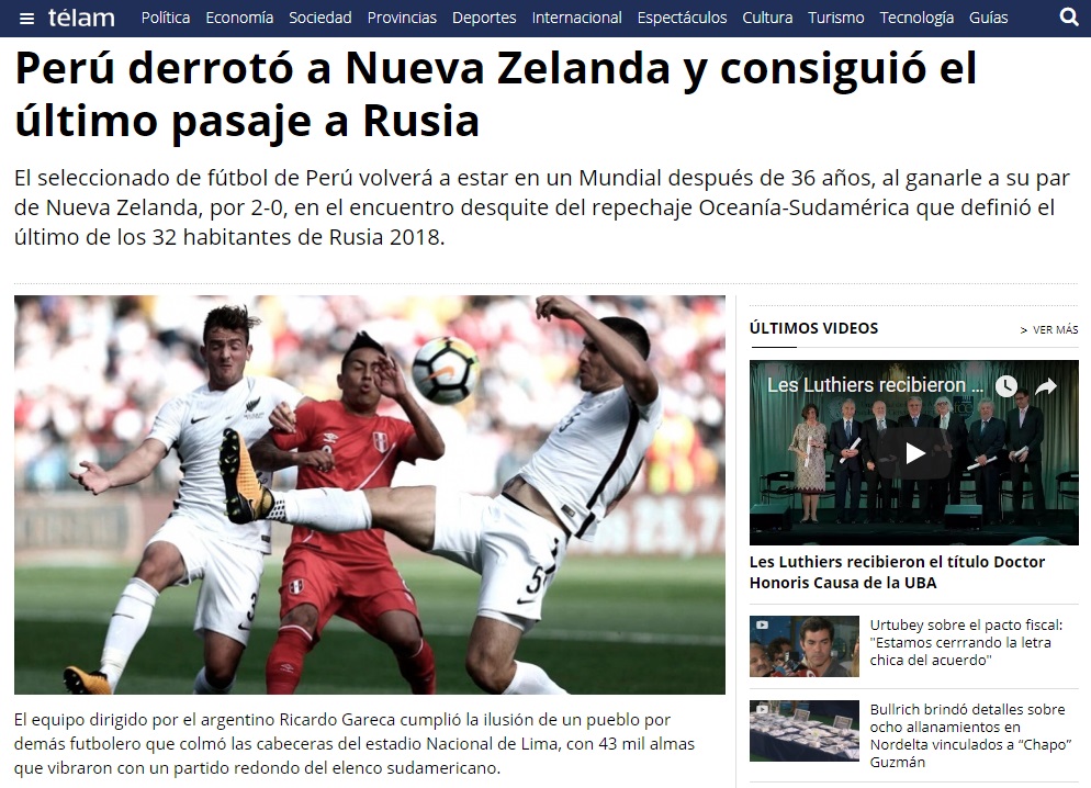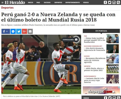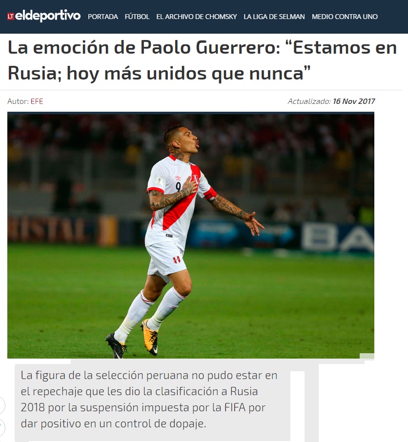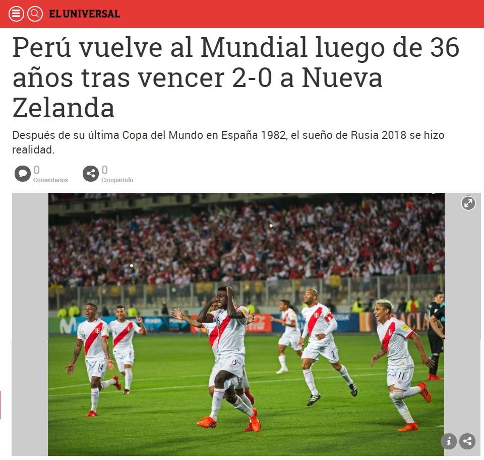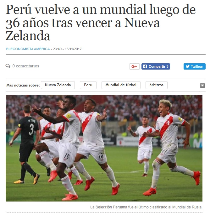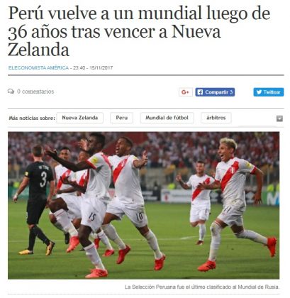 Desde el país anfitrión, el portal Russia Today (RT) elogió la ofensiva peruana y consideró que la selección mereció ganar el partido y acceder al mundial.