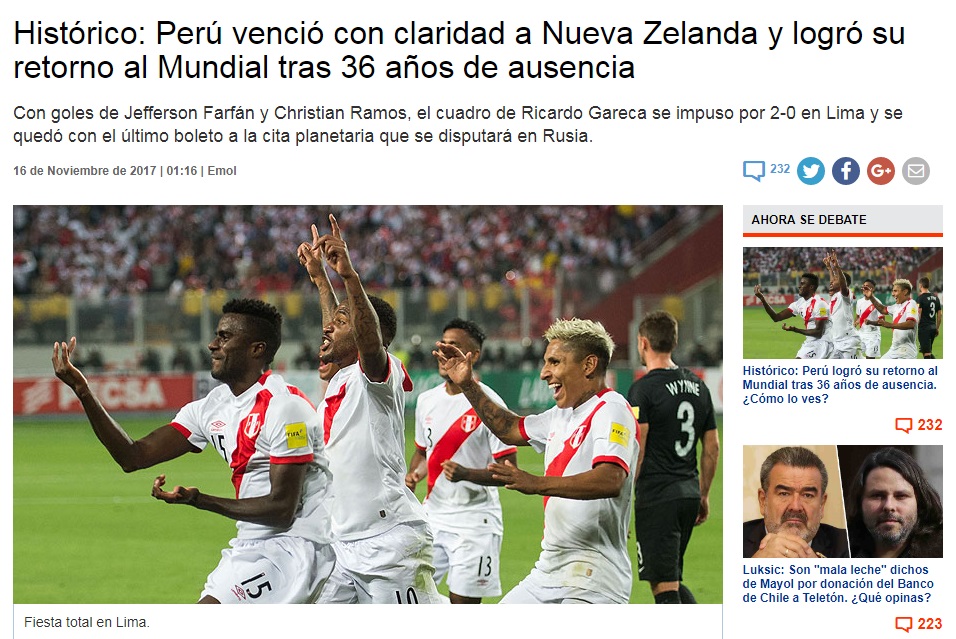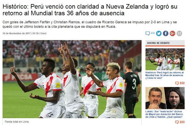 La prensa chilena felicitó el trabajo de la selección dirigida por Ricardo Gareca. El diario online El Mercurio calificó el triunfo de la blanquirroja como «histórico» y La Tercera recordó las palabras de Paolo Guerrero: «Estamos en Rusia, hoy más unidos que nunca».