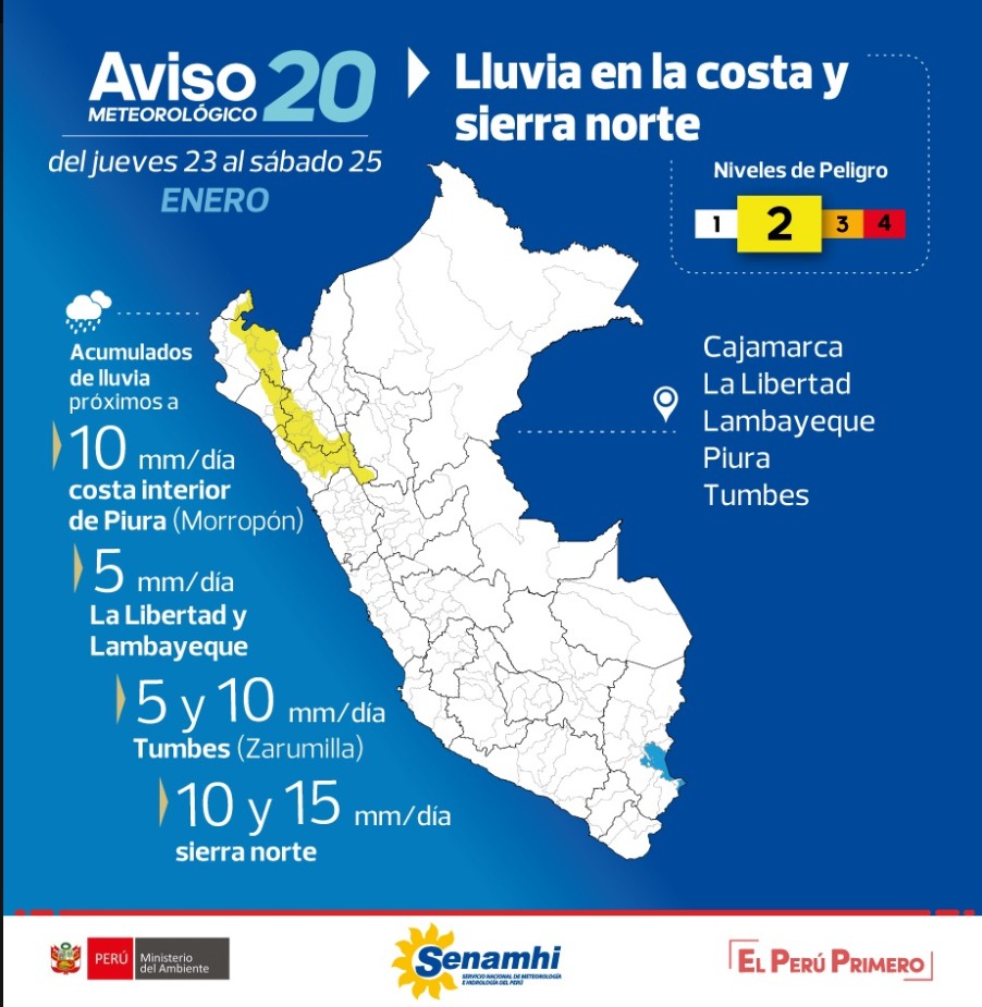 Según el Aviso Meteorológico Nacional N°020 del Servicio Nacional de Metereología e Hidrología (Senamhi) se prevé la ocurrencia de precipitaciones de ligera a moderada intensidad en la costa interior y sierra occidental de Piura desde el jueves 23 al sábado 25 de enero, en horas de la noche-madrugada.