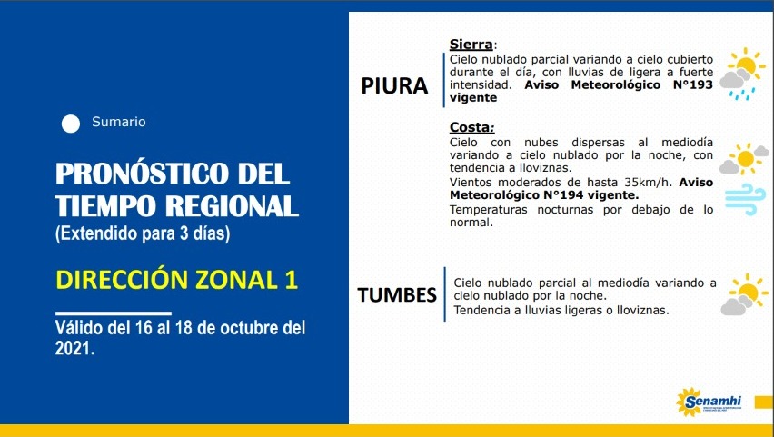 El Senamhi pronostica lluvias de ligera a fuerte intensidad en la sierra de Piura desde este sábado 16 al lunes 18 de octubre. En la costa piurana se presentarán lloviznas, según el Aviso Meteorológico N° 193 del Senamhi.