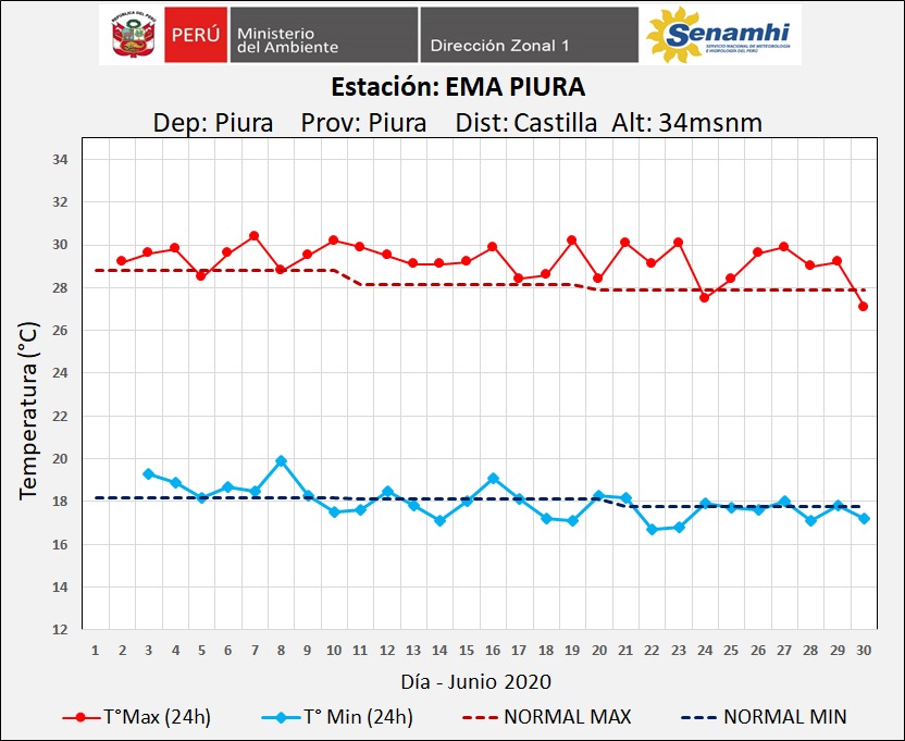 Según el reporte del Senamhi, hoy jueves 2 de julio, Piura registró 16.4 °C, la más baja en lo que va del año 2020. Asimismo, pronostica que las temperaturas mínimas durante los próximos días serán entre los 16 y 18 °C.