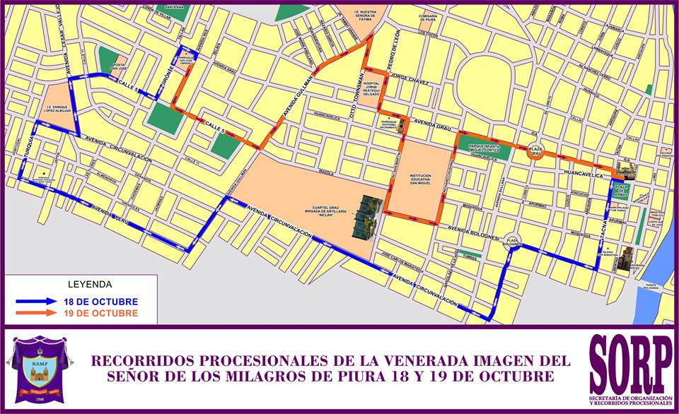 RECORRIDO: Avenida Vice, Calle 5, Avenida Gullman, Jirón Otto Townsman, Calle Jorge Chávez donde hará su ingreso al Hospital Jorge Reátgui, Calle Pedro de León, Avenida Grau, Avenida San Martín, Cuartel Grau, Avenida Bolognesi, Calle Richard Cushing, Avenida Grau, Jirón Tacna, Jirón Huancavelica, hasta ingresar a la Parroquia San Miguel Arcángel – Catedral de Piura.