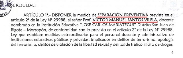 En ese sentido, Santos Vilela no podrá dictar clases en el colegio José Carlos Mariátegui de San Juan de Bigote, ni en ninguna otra institución, hasta que culminen los cuatro procesos judiciales que afronta. En caso de que el profesor sea condenado, se le podrá aplicar la separación definitiva del ejercicio docente.