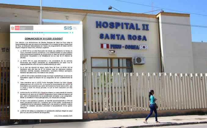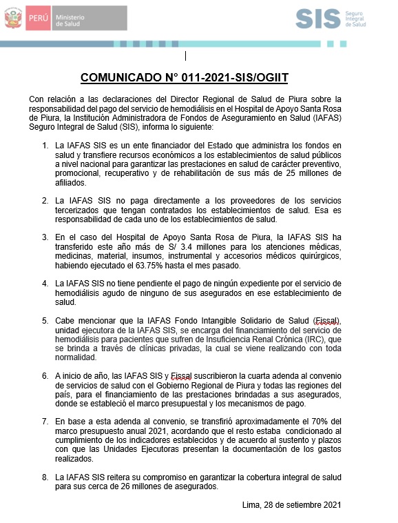 A través de un comunicado, la Institución Administradora de Fondos de Aseguramiento en Salud (IAFAS) del SIS, informó que no tiene pendiente el pago de ningún expediente por el servicio de hemodiálisis agudo de ninguno de sus asegurados en el hospital Santa Rosa. También manifestaron que no pagan directamente a los proveedores de los servicios tercerizados que tengan contratados los centros de salud por lo que, los pagos son de responsabilidad de cada uno de los establecimientos de salud.