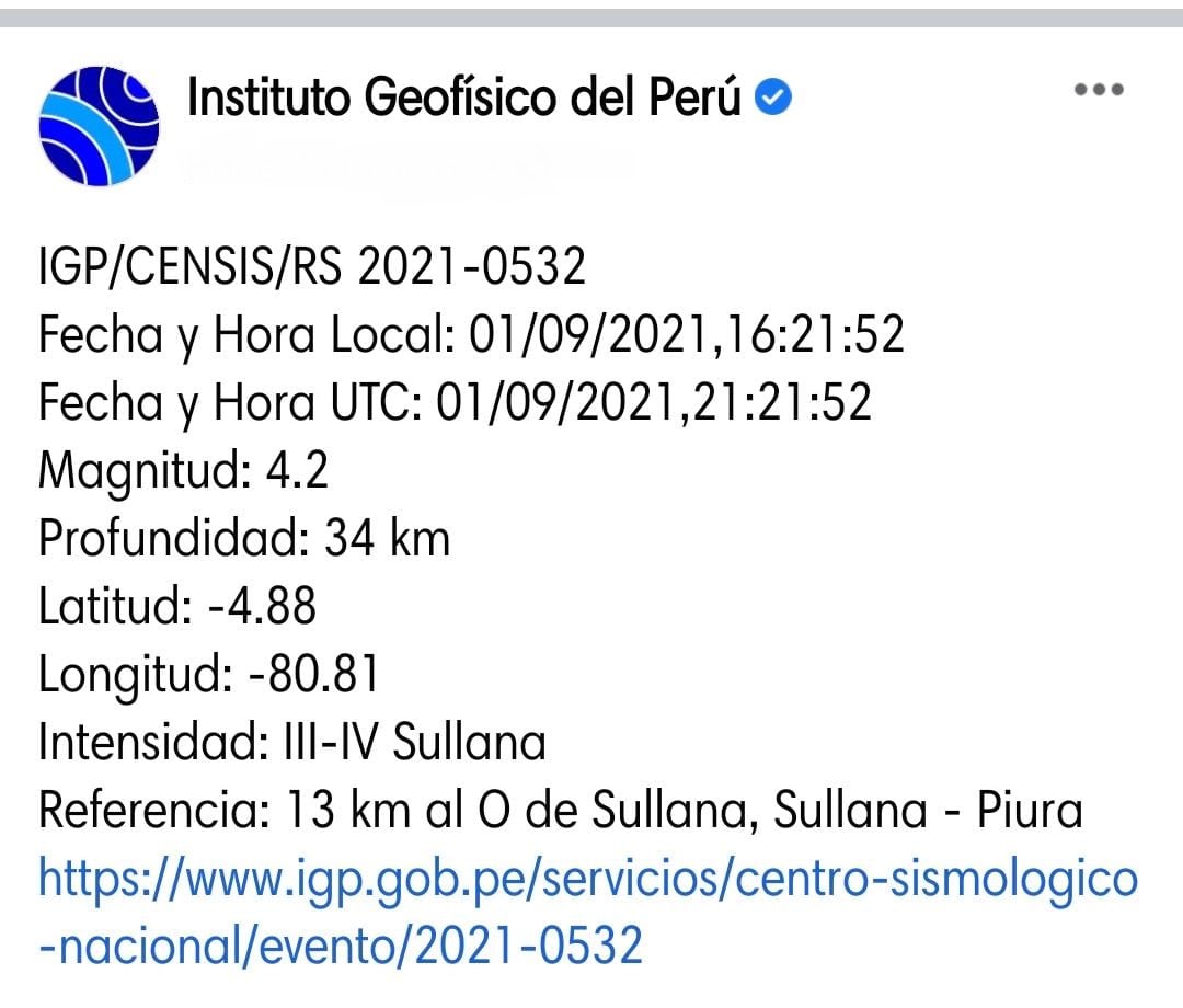 Este miércoles 01 de setiembre se registró un sismo en la provincia de Sullana, a las 04:21 de la tarde, con una magnitud de 4.2 grados. El epicentro del sismo se localizó a 13 kilómetros al oeste de esta provincia y su profundidad fue de 34 kilómetros, según lo indica el Instituto Geofísico del Perú (IGP).