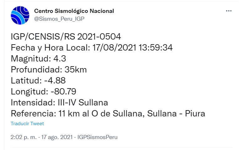 Este martes 17 de agosto se registró un sismo en la provincia de Sullana, a la 01:59 de la tarde, con una magnitud de 4.3 grados. El epicentro del sismo se localizó a 11 kilómetros al oeste de esta provincia y su profundidad fue de 35 kilómetros, según lo indica el Instituto Geofísico del Perú (IGP).