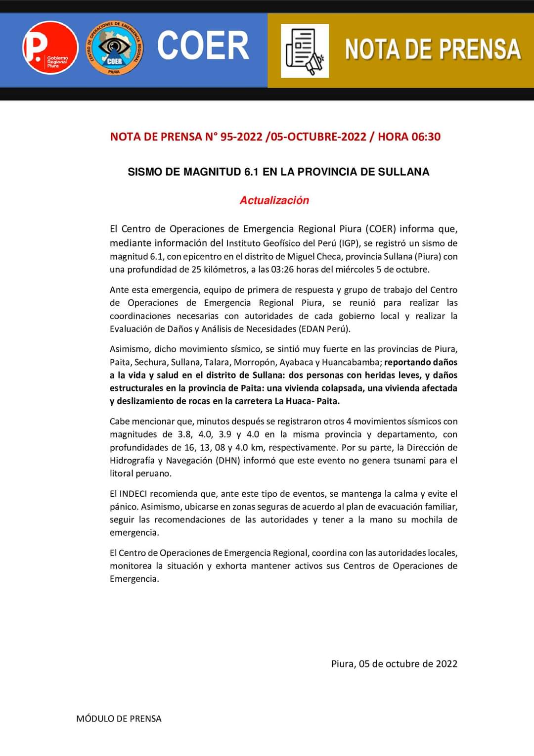 El Centro de Operaciones de Emergencia Regional (COER) reportó que el sismo registrado en la provincia de Sullana, cuya magnitud fue de 6.1 ha dejado dos personas con heridas leves. Una de ellas es una gestante de 39 años que fue trasladada al hospital EsSalud de Sullana. Así como una mujer de 20 años que habría tropezado al bajar las escaleras para salir de su vivienda.