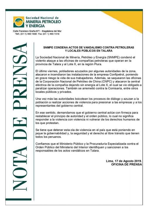 La Sociedad Nacional de Minería, Petróleo y Energía (SNMPE) condenó el violento ataque a las oficinas de compañías petroleras que operan en la provincia de Talara y al Lote X, en la región Piura.