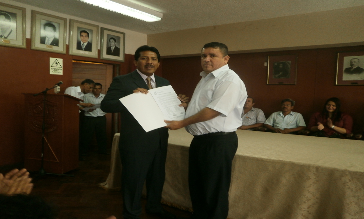 El alcalde de Sullana, Carlos Távara Polo, hizo entrega de la Resolución de Alcaldía 060 – 2015 / MPS y credencial correspondiente al secretario general del SITRAMUN, Cesar Patow Vinces y a todos los miembros de la nueva Junta Directiva.