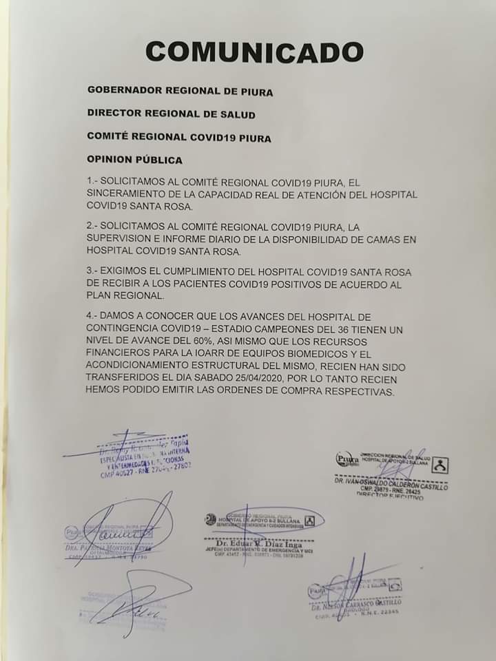 La dirección del hospital de Apoyo II de Sullana emitió un comunicado dirigido al comando covid-19 regional en el que pide el sinceramiento de la disponibilidad de camas y capacidad de atención del hospital Santa Rosa. Informa también que la unidad del estadio Campeones del 36 recién estaría lista dentro de 10 días.