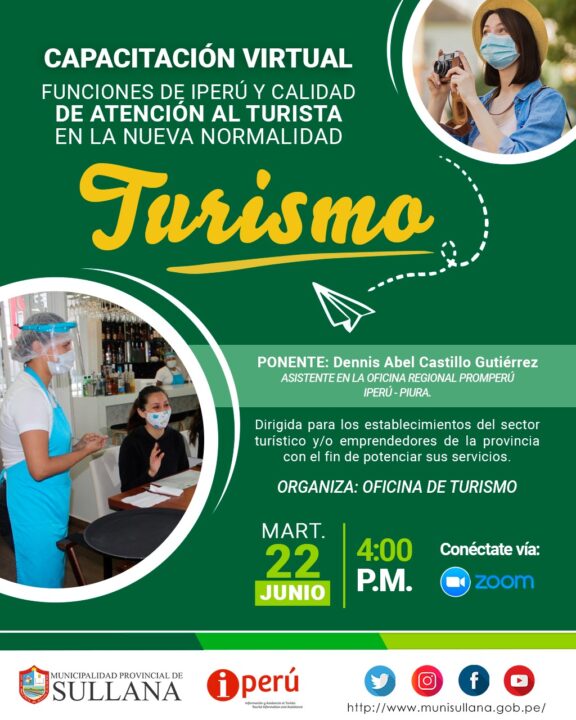 Con el fin de mejorar la calidad de atención al turista en la nueva normalidad y también dar a conocer las funciones del IPERÚ (Información y Atención al Turista), este martes 22 de junio, a las 4 pm, se realizará una capacitación virtual para comerciantes de este rubro.
