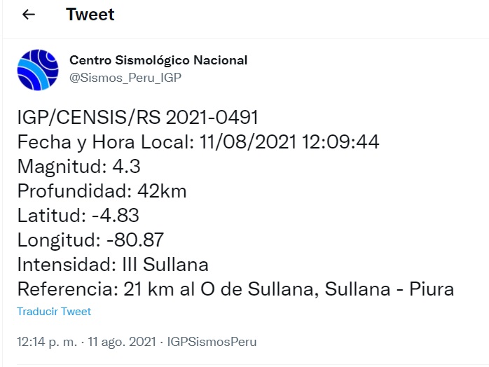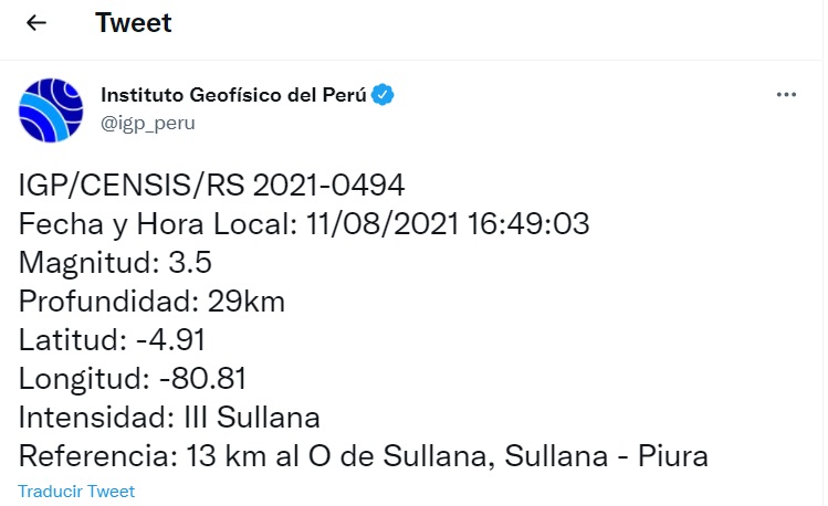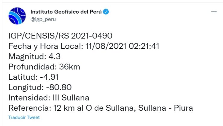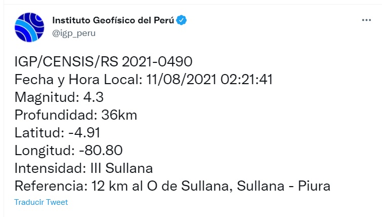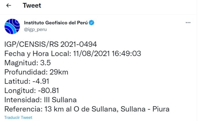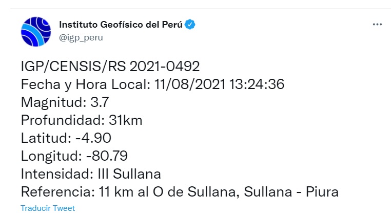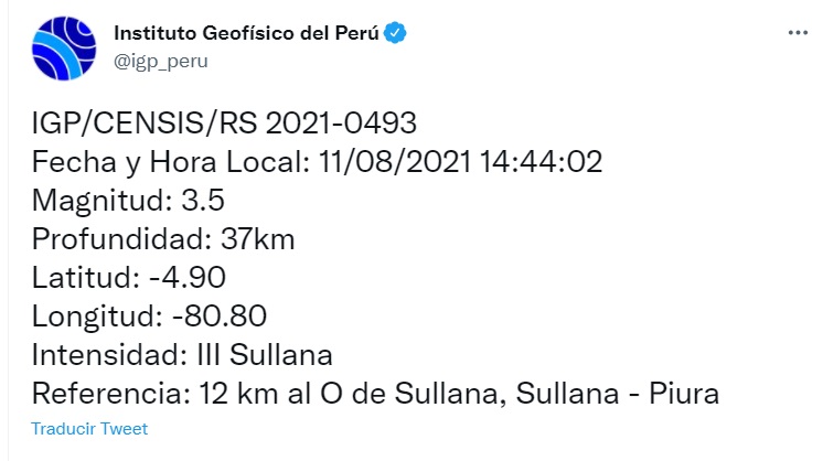 Hasta las 5 de la tarde de este miércoles 11 de agosto, la provincia de Sullana registró cinco sismos, según informó el Instituto Geofísico del Perú (IGP).