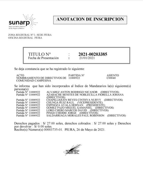 Según el documento emitido por SUNARP, el líder de la lista roja, Hernán Espinoza, estará a cargo de la comunidad hasta el 31 de diciembre del 2022, tal como se decidió en las elecciones comunales de diciembre del 2020.
