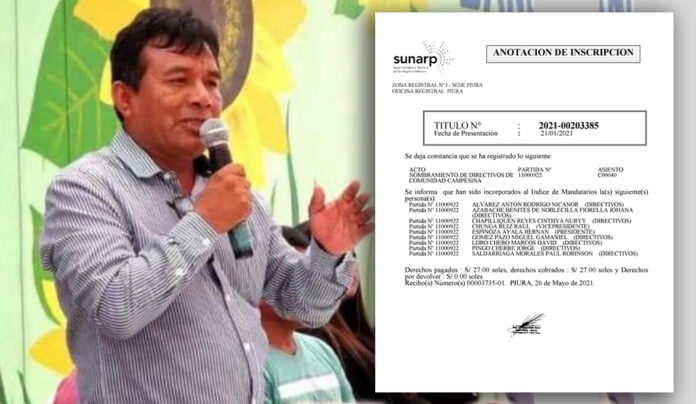 La Superintendencia Nacional de Registros Públicos (SUNARP) de Piura, ratificó la inscripción de Hernán Espinoza Ayala como presidente de la comunidad campesina San Martín de Sechura. Este miércoles 26 de mayo, también se determinó que Raúl Chunga Ruíz asumirá el cargo como vicepresidente y Cinthya Chapilliquén Reyes como secretaria.