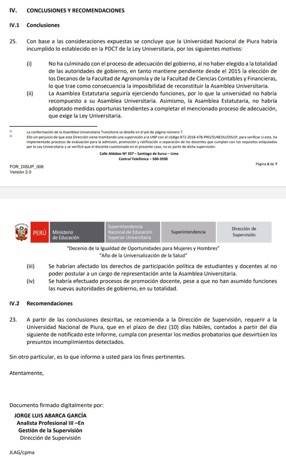 La Sunedu advierte que en la Universidad Nacional de Piura  se han dado ascensos ilegales de catedráticos y se ha limitado la participación de los estudiantes y docentes en la toma de decisiones