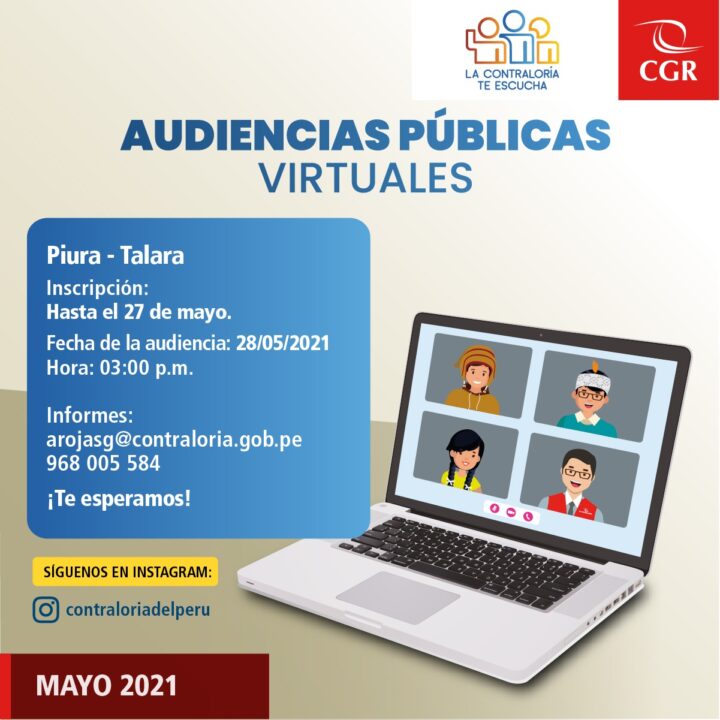 La Contraloría General convoca a toda la población de la provincia de Talara a participar en la audiencia pública virtual “La Contraloría te escucha”, que se realizará el viernes 28 de mayo a las 3 de la tarde.