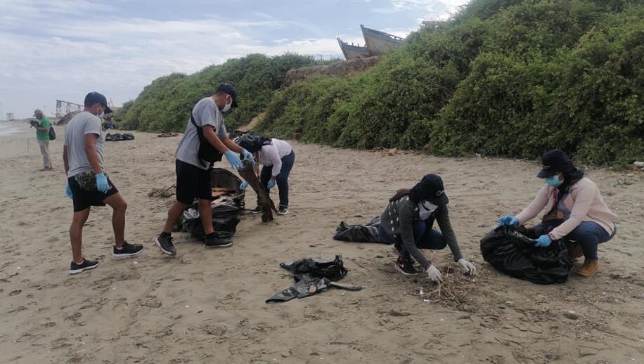 Pescadores de la zona, integrantes del club San Pedro, al igual que promotores y sensibilizadores ambientales, con todas la medidas de bioseguridad para evitar el contagio del COVID-19, se sumaron a la labor de limpieza de este balneario.