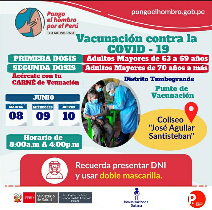 La vacunación contra la covid para los adultos mayores de 63 a 69 años en el distrito de Tambogrande continuará desde el martes 08 hasta el jueves 10 de junio. Además, en las jornadas se aplicará la segunda dosis de la vacuna a los adultos mayores de 70 años a más.