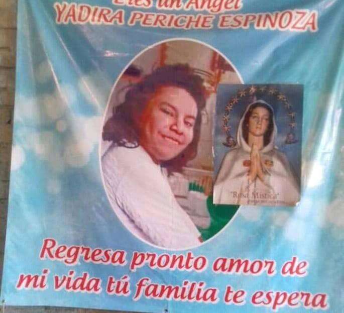 Dios ¿por qué me has castigado a mi? ¿Qué te hice, en qué te ofendí, mi señor? te cambio mi vida por la de mi hija. Te amo mi Yadira Danitza Periche Espinoza, la ‘totita’ como le decías a mi madre, sufre mucho, te extraña mucho, no deja de pensar en ti, por favor no dejen de llamarme a mi número 943371972, se lo agradeceré de todo corazón, no sé que más decir a todas las madres que sus hijas han sido raptadas, no perdemos las esperanzas de volverlas a encontrar, que Dios nos de la fuerza que necesitamos, la fe mueve montañas y la dicha de estar con ellas o ellos, YADIRA te voy a encontrar, no desmayaré hasta volverte a ver, te extraño mi bebe, mi reina;  al suboficial que no nos olvide y me siga ayudando,  por favor, se lo imploro de todo corazón».