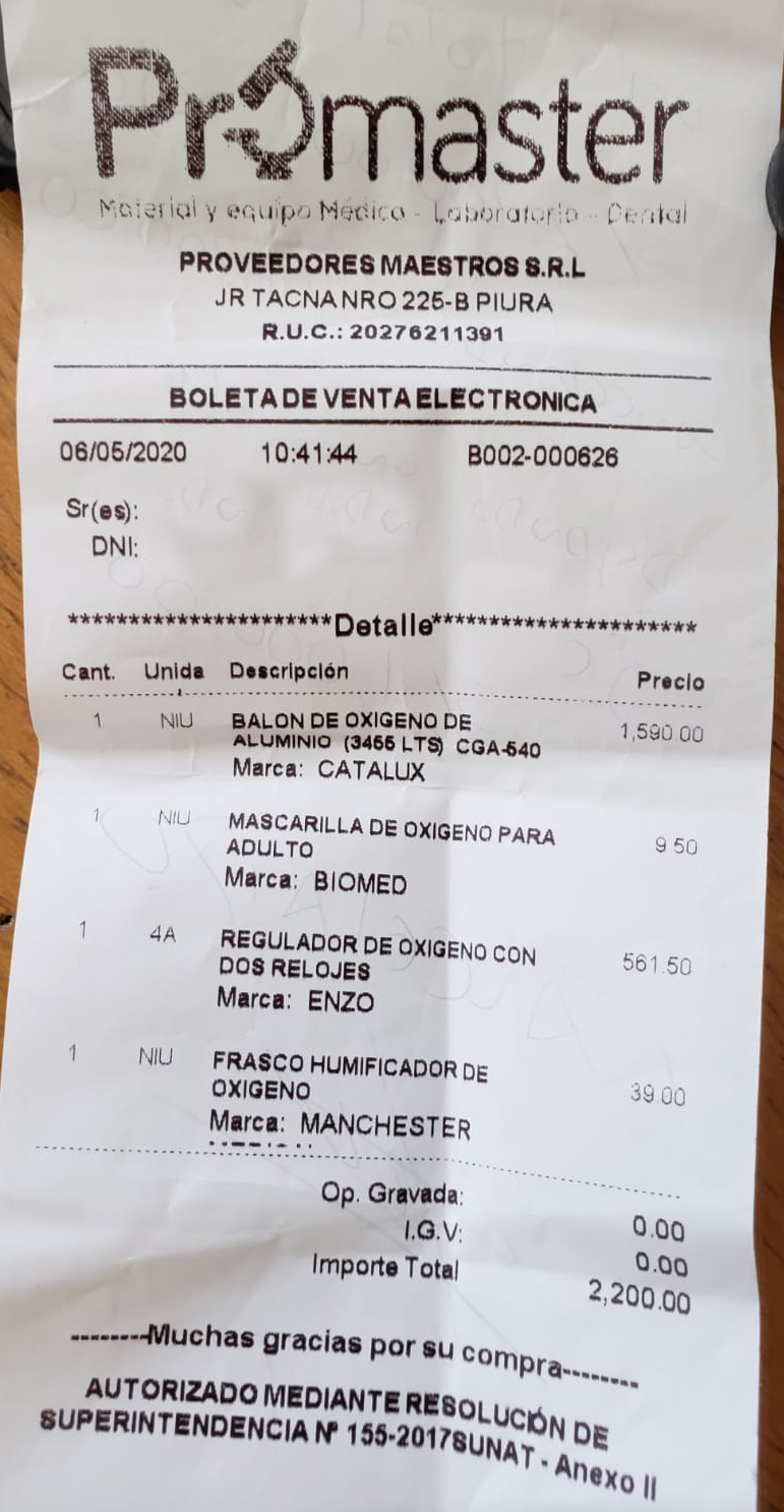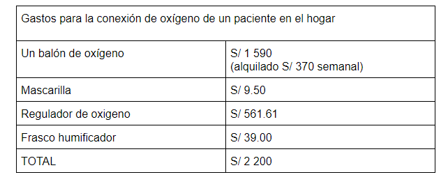 Por ahora los familiares de esta paciente, que viven en un inmueble de Los Algarrobos, están haciendo de enfermeros y técnicos. Ellos debieron habilitar las válvulas y la mascarilla para conectar a su abuela. Solo esta instalación tuvo un costo de 1,500 soles, a ello sumarle los 370 soles del alquiler semanal del balón.