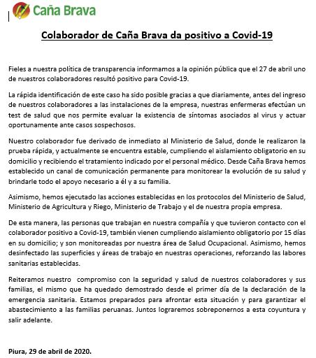 “La rápida identificación de este caso ha sido posible gracias a que diariamente, antes del ingreso de nuestros colaboradores a las instalaciones de la empresa, nuestras enfermeras efectúan un test de salud que nos permite evaluar la existencia de síntomas asociados al virus y actuar oportunamente ante casos sospechosos”, se lee en el documento.