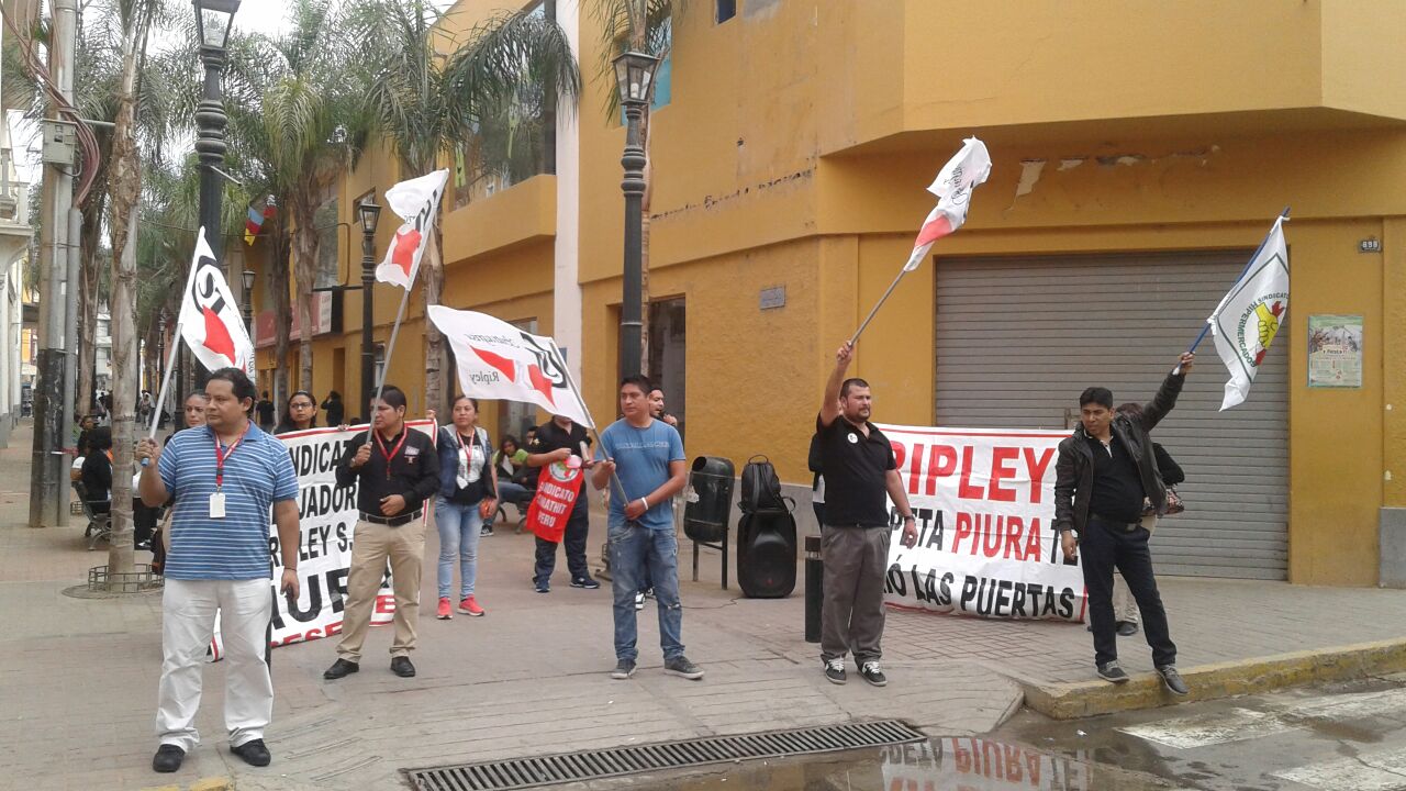 Los trabajadores de Ripley protestan en las afueras de la tienda ubicada en el centro de Piura en rechazo al presunto despido arbitrario de uno de sus compañeros.